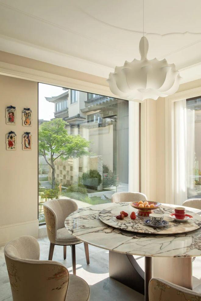 用餐区借由墙纸、座椅软包印花、奢石桌面的纹理
