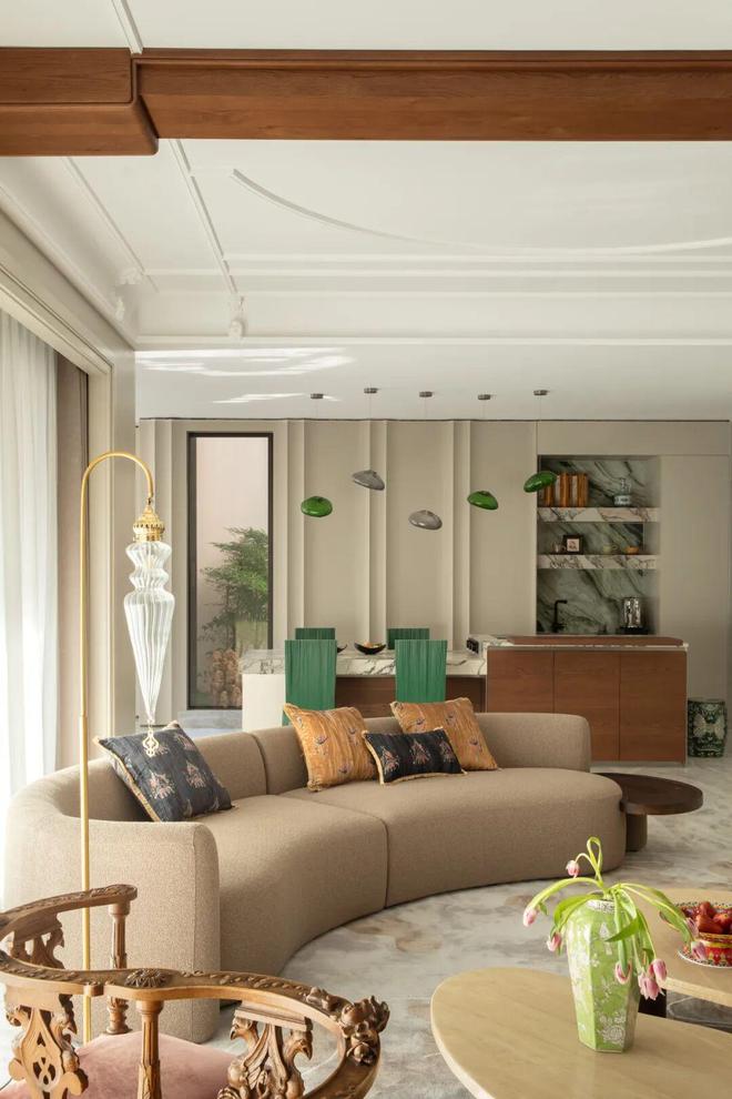 客厅真正动人之处,在于它不受困于某种风格的定义,或刻意追求统一,而是遵从居住者真实的生活习性,在多年来积累的生活痕迹中慢慢生长而成。女主人保留了许多旧宅的家具与陈设:一盏沿用多年的老灯,一把旧椅,一组瓷器收藏,以及几件陪伴多年的边柜与器物,都被重新带入新空间。