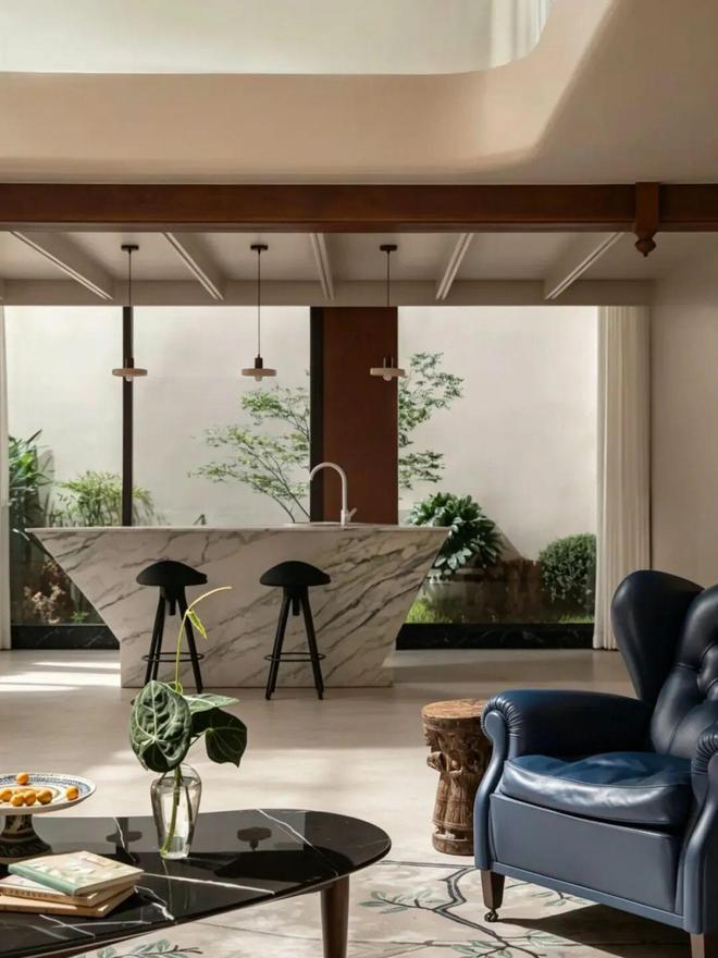 建筑为地上两层、地下两层,原始结构在保留传统尺度感的同时,也带来了采光偏弱、视线较为封闭的现实问题。设计师在设计之初,便将“引光入室”视为整个改造的起点。原本位于南向最佳景观面的老人房被调整至北侧,将整个一层公共区域彻底打通,让客厅与庭院直接对话。原有的厚重墙面被拆除,局部改为通透的落地玻璃,所有窗洞也被尽可能放大,让天光与庭院绿意顺势渗入室内,改变了传统合院偏向封闭的内外关系。