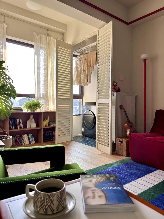 晾晒区柜门做开孔处理,可以增加晾晒区的通风性;关上门后,又不会破坏客厅的整体感,非常巧妙。