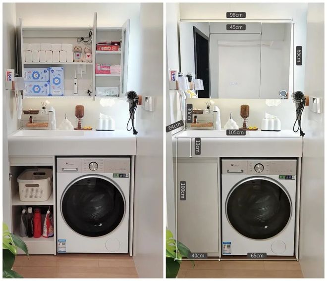1)将洗衣机和烘干机叠放起来,再搭配一个70cm宽的台盆,丝毫不会感到拥挤,并且连洗衣池都有了。