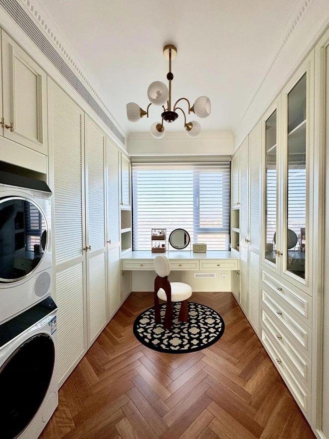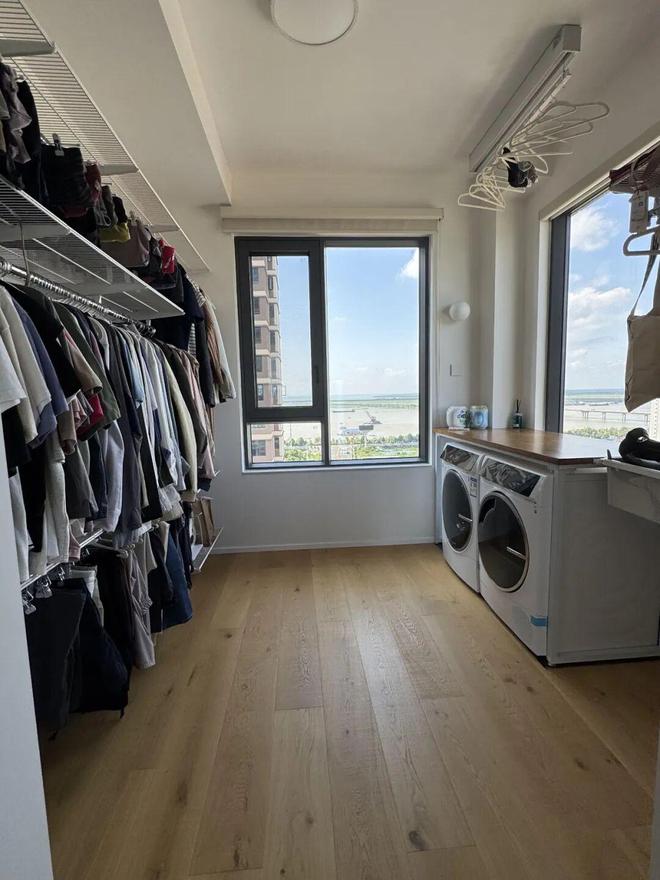 比如「网友@张之大腿」家的衣帽间就在卫生间隔壁,再加上拥有双面采光通风条件,就将洗衣机和烘干机放了进去。