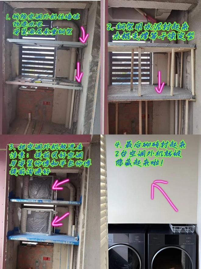 1、拆掉阳台和外机平台之间的墙体,重新安装两层承重钢架,并提前将空调外机装进去,最后再封起来。