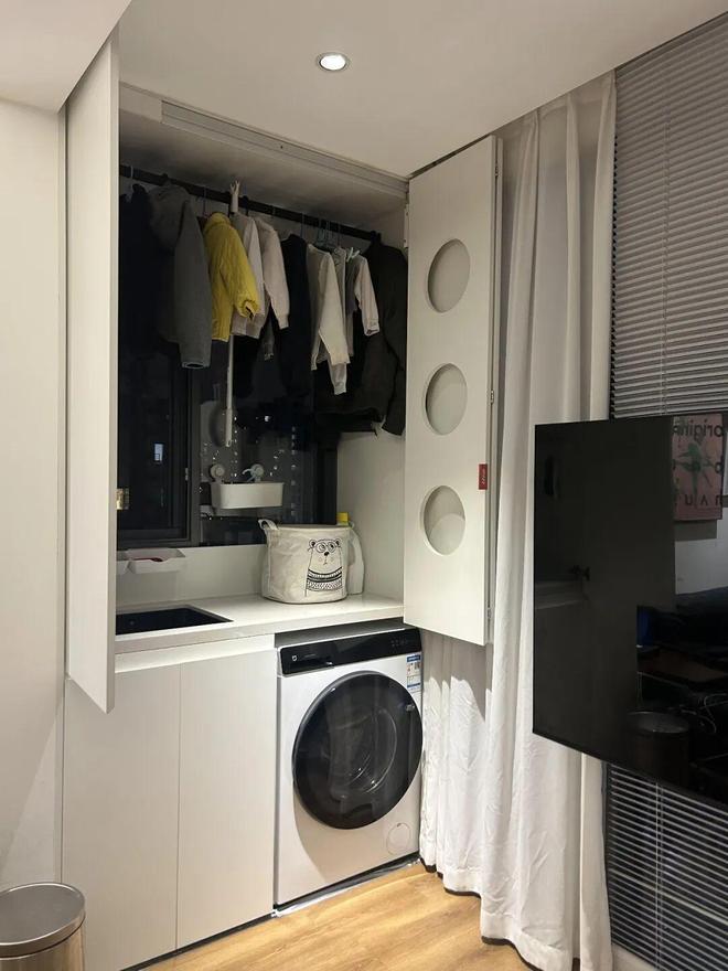 再比如「网友@暖居」不仅在电梯间设计了洗衣柜,还安装上了挂衣架,彻底释放出了阳台面积。