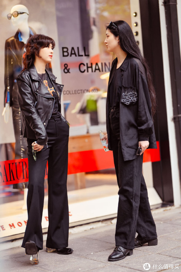 另外,还可以在服装面料上花心思,强调材质之间的不同,在强烈的对比感下,丰富造型层次感,强化整体穿搭的时尚完成度。比如皮革上衣配西装小黑裤,涤纶上衣配牛仔小黑裤,即便是All black穿搭,有了材质面料的对比,也会让造型看起来简约而不简单。