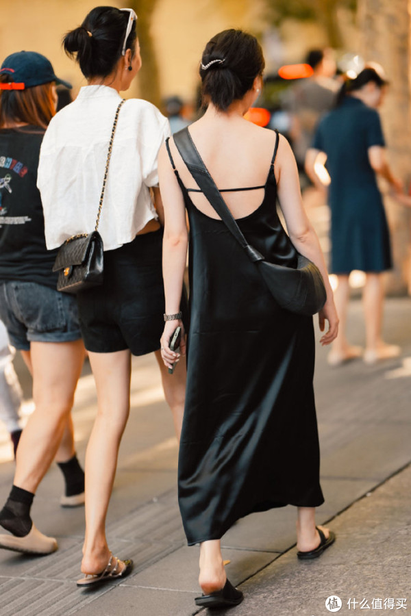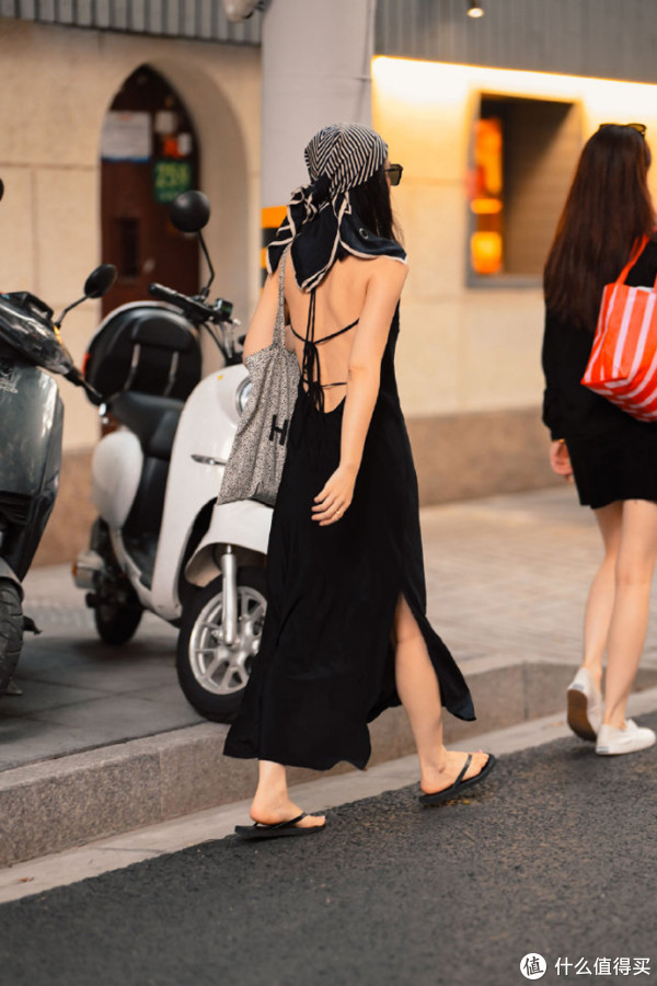 在小黑裙的选款上,可以适当增加露肤面积,提升穿着的清凉舒适度,强调设计感的同时也能让裙装更加具有辨识度,赢得不费力的时髦。吊带裙或露背裙,增加脖颈、肩部、手臂和背部的露肤面积,黑色基调削弱了风尘、媚俗感,看似性感却不俗气。