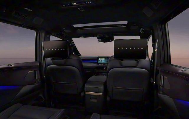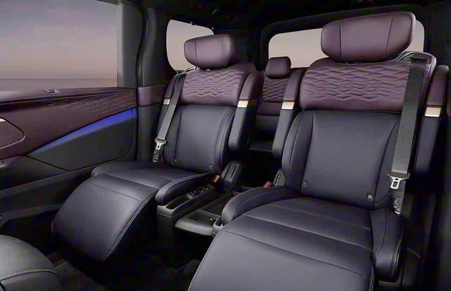 新车采用的是2+2+3座椅布局,第二排的两个座椅使用了折叠式的双扶手,还提供了腿托,两个座椅中间还带有可折叠式的储物格,前排座椅的头枕后部提供了两个显示屏。