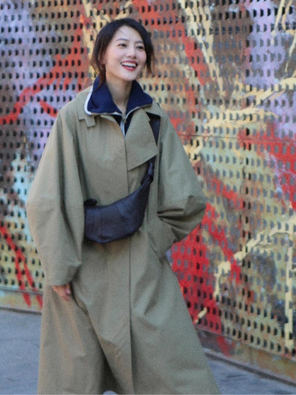 身上这件风衣版型比较宽松,正是因为如此,小个子女生不太容易驾驭。比如,袖子松量多,虽然袖口有收紧趋向,但很容易显得手臂粗且短;其他部分松量多的话会容易压身高,这对小个子女生来说都不是优势,因此,娇小女生在挑风衣时,一方面要选对衣长,另一方面风衣松量也十分重要,以免在衣柜里落灰,钱白花了。