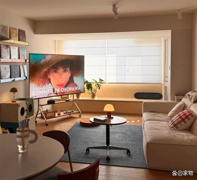 不做电视柜的设计是真的很灵活,即便是85吋的电视,也可以通过这带滚轮的支架随意移动,既节省了空间,让竖厅视觉上显得大了不少,又能妥善放置电视,并通过底板架收纳机顶盒、游戏机等物,一举两得。