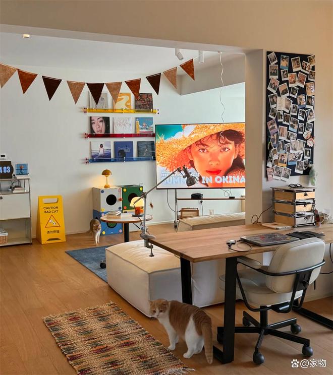 家里原本的电视墙,现在被切分出一半,将其与书房打通,而书房则顺势做成了开放式格局,书桌就放在如今打通的半墙处,坐在这里办公的时候,客厅场景可以尽收眼底,想来也是挺惬意的啦~