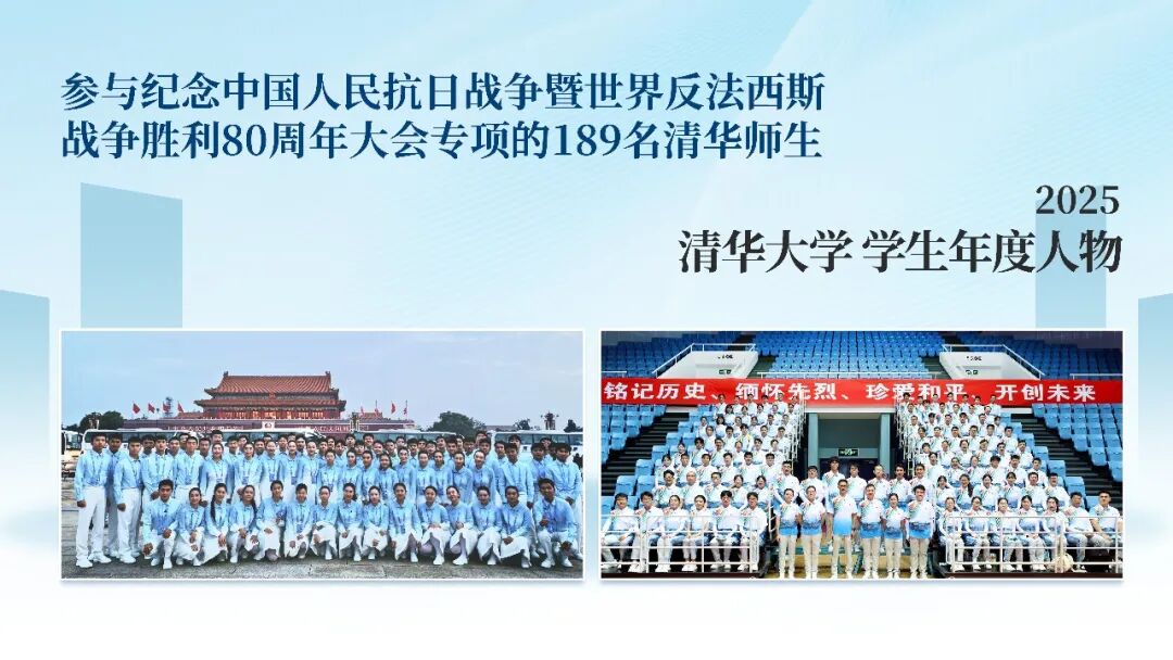 2025年9月3日,纪念中国人民抗日战争暨世界反法西斯战争胜利80周年大会在天安门广场隆重举行。清华大学81名合唱团成员与108名志愿者,共189名师生,以青春之我展现使命担当。