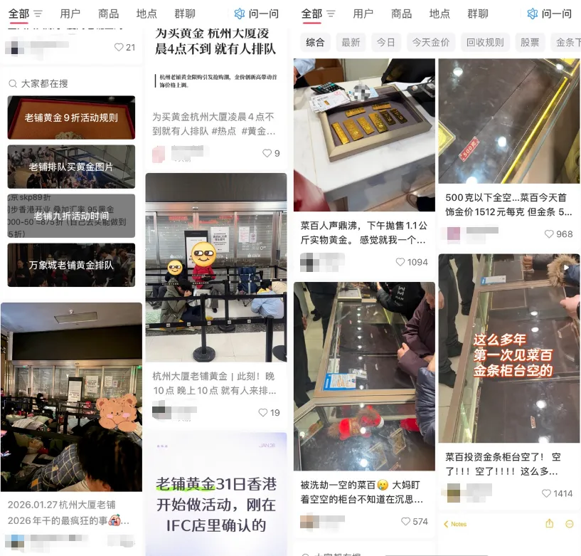 尽管金价高位波动,各地仍出现了不少排队购金现象。记者浏览发现,近日许昌胖东来时代广场、北京SKP商场、北京菜百黄金均出现排队热潮,有柜台黄金基本售罄。其中,老铺黄金多门店因活动力度较大,出现消费者通宵排队购金。