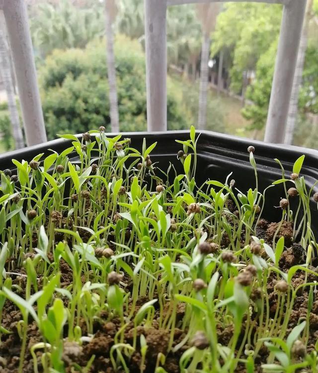 3、香菜发芽了之后,就要抓紧时间晒太阳,把花盆放在阳台上露台上,光照最充足的地方,香菜苗就喜欢阳光,多晒太阳,它不会长得太高,不会容易徒长,会长得矮壮茂盛一些,叶子会绿油油的。