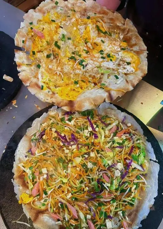 老威海风味的菜饼子店,现烙现卖香气扑鼻。白菜鸡蛋馅菜饼子外酥里软,蔬菜清甜十足;韭菜虾仁馅鲜香味浓。