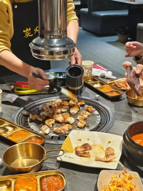 主打炭火烤肉的宝藏店,烟火气十足。厚切猪五花烤得焦香,油脂香满口,包上蒜片和生菜超解腻。