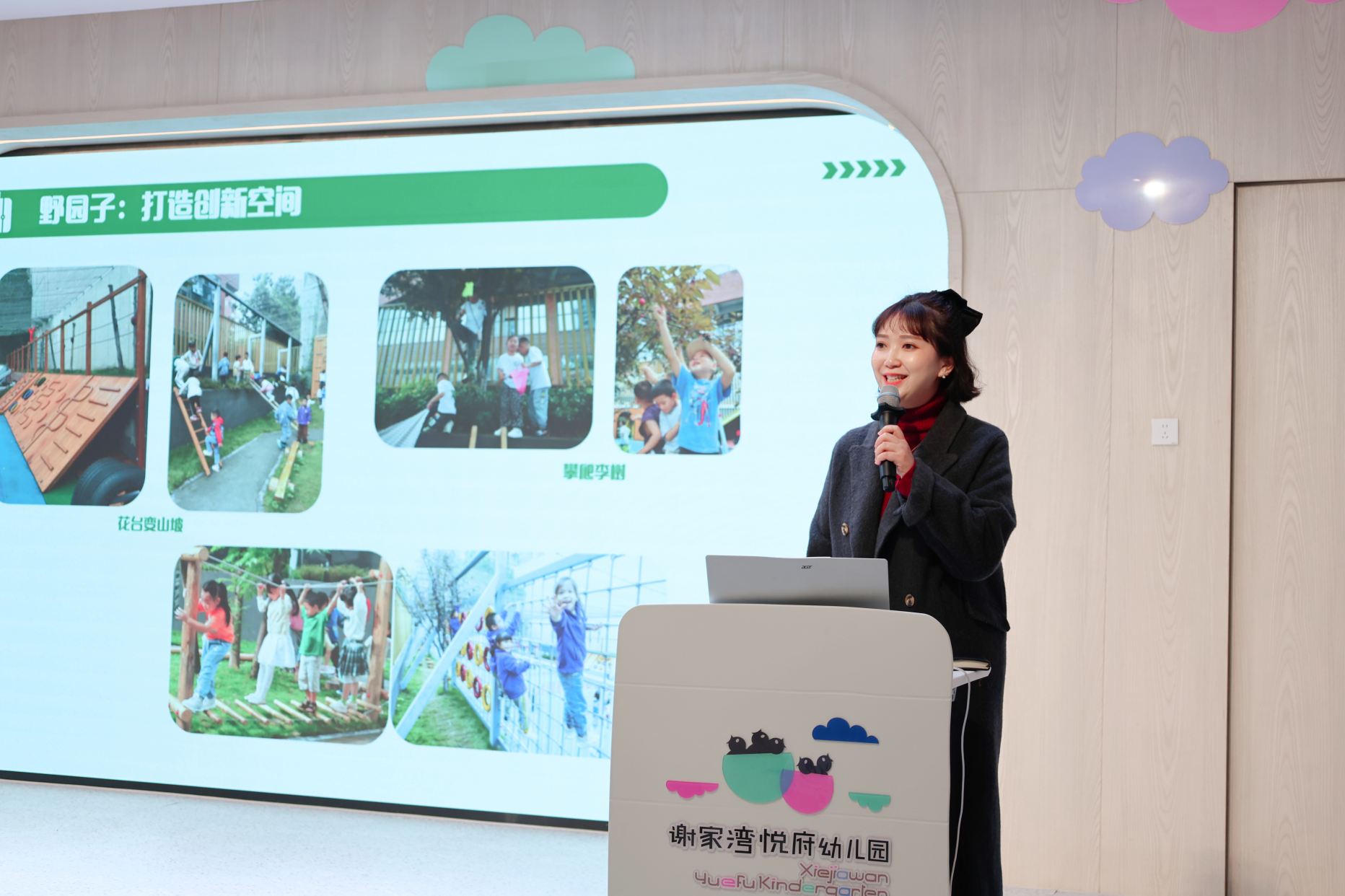“我们相信,创新不是教出来的,而是在‘野’的环境中自然生长的……”在分享交流环节,华岩新城实验幼儿园园长游璐媚作《“野趣教育”三年探索之路》的主题分享,充分展现了幼儿园卓越的教学成果与育人智慧。精彩的分享赢得了现场阵阵掌声。