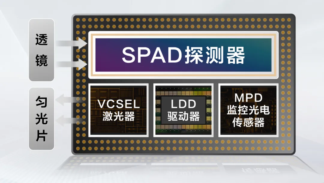VCSEL 激光器芯片则以 50% 功率转换效率与 100W 峰值光功率提供更稳定、更节能的发射能力。