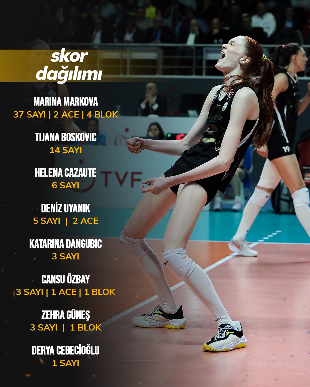 本场比赛最大亮点无疑是来自瓦基弗银行的俄罗斯主攻玛丽娜·马尔科娃。她全场豪取37分(62扣32中3拦2发),29个一传5个失误,一传到位率38%,多次在关键分中屡次拯救球队,堪称本场最有价值球员。