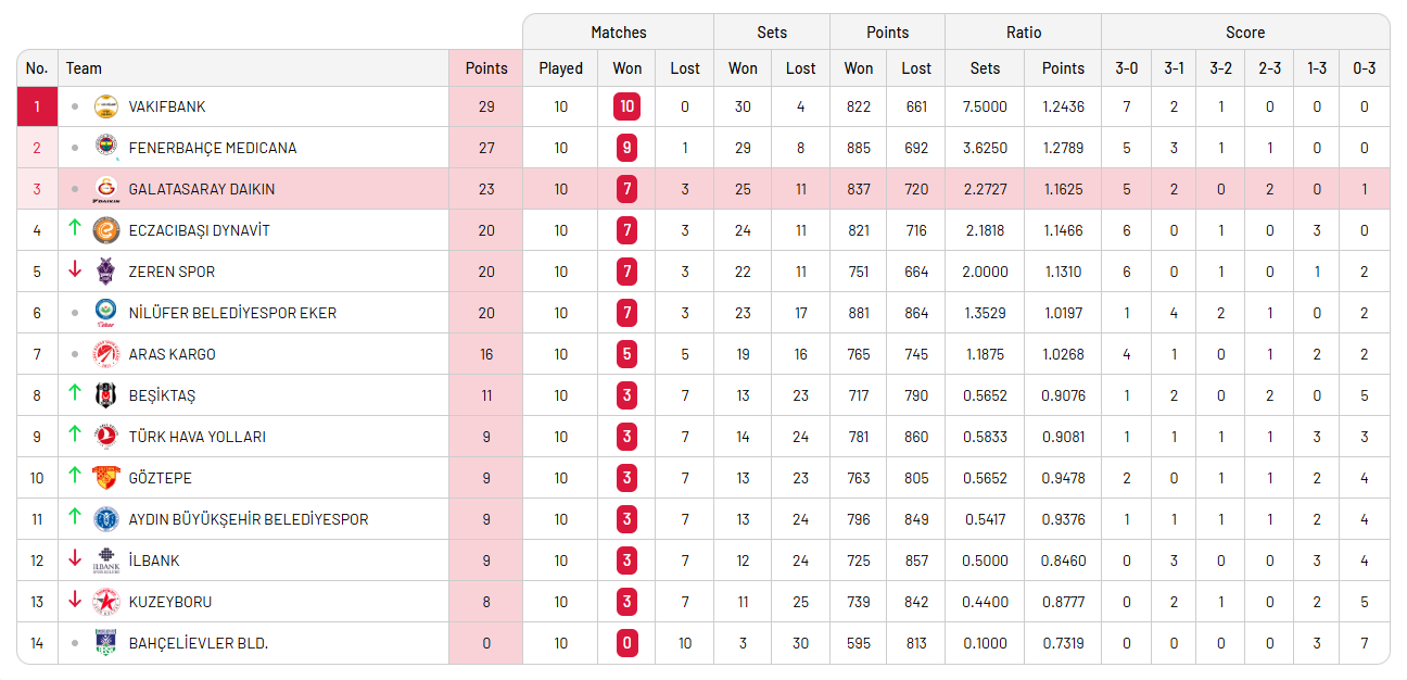 本轮过后,土超女排积分榜局势再度变化,瓦基弗银行10战全胜,独占榜首,费内巴切9胜1负,紧随其后,王媛媛球队加拉塔萨雷7胜3负积23分排名第三,伊萨奇巴希7胜3负第四,泽伦体育7胜3负第五,尼吕费尔女排7胜3负第六。