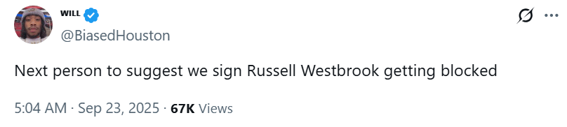 随后,多家美媒呼吁火箭用老将底薪签下自由球员拉塞尔-威斯布鲁克。
