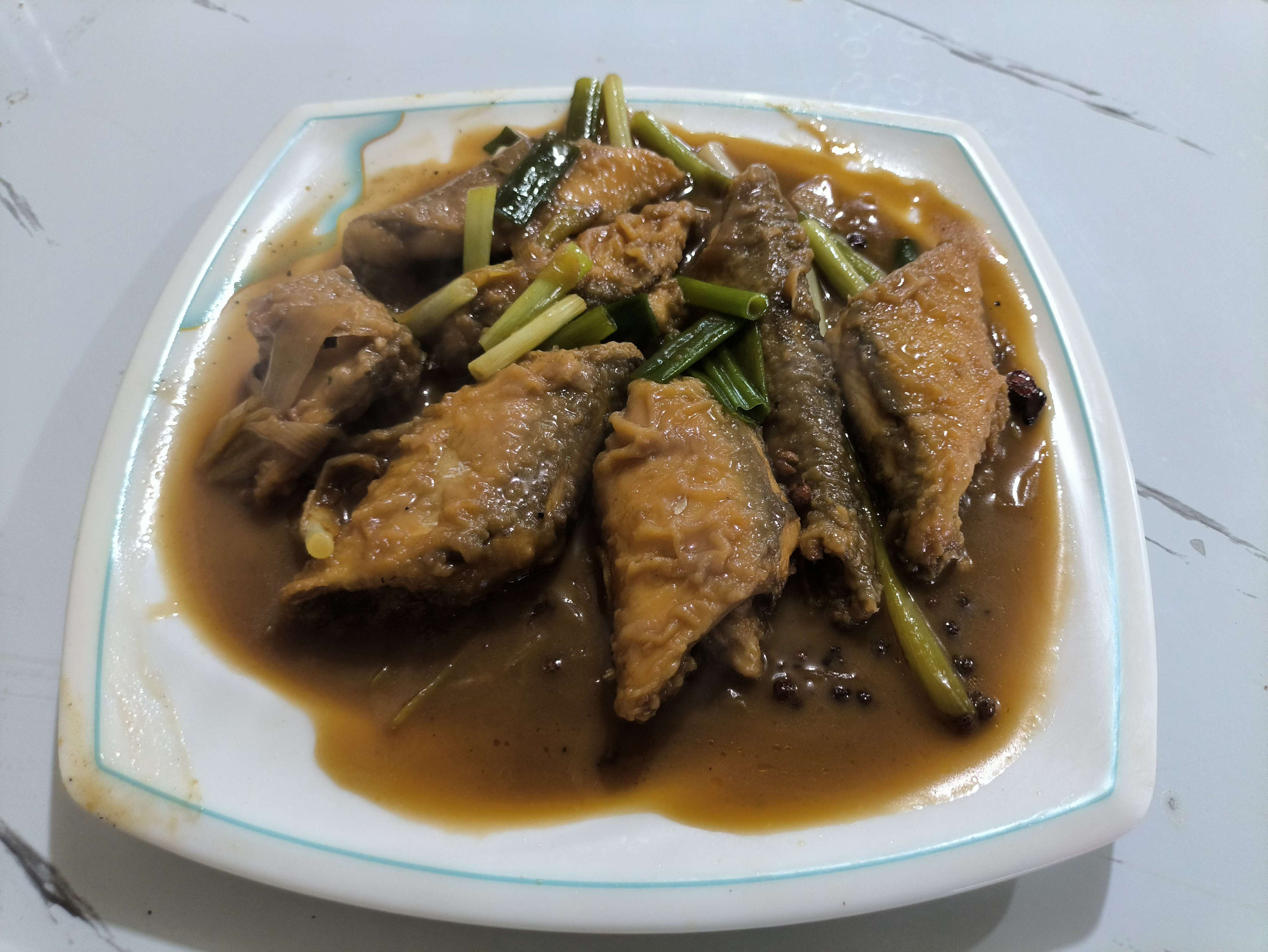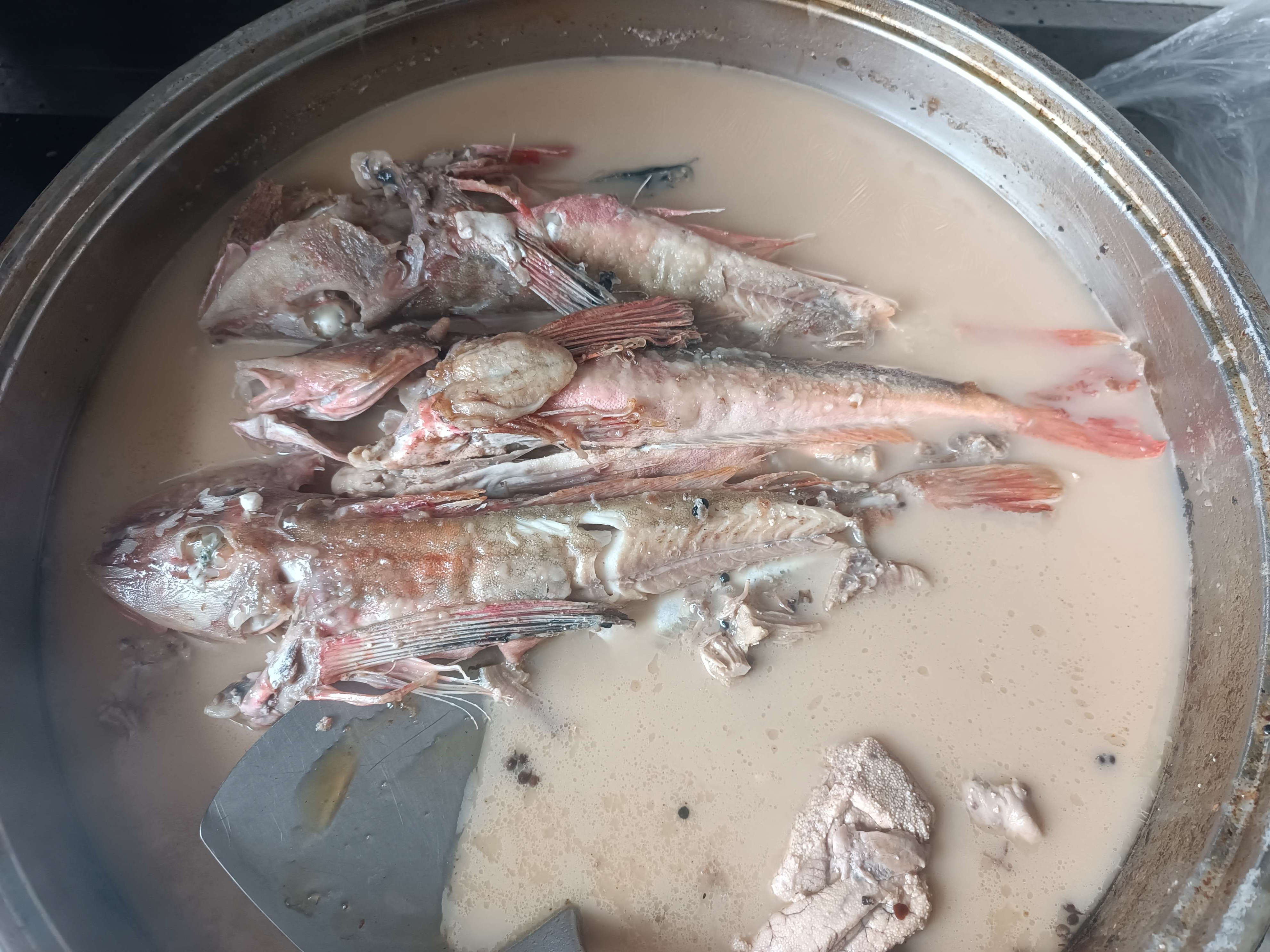来一张本人的烹饪图,具体做法是先煸猪油,然后炒一点瘦肉,把处理好的绿鳍鱼放到平底锅里,双面油煎之后加入水和花椒等,最后煮沸就可以了。
