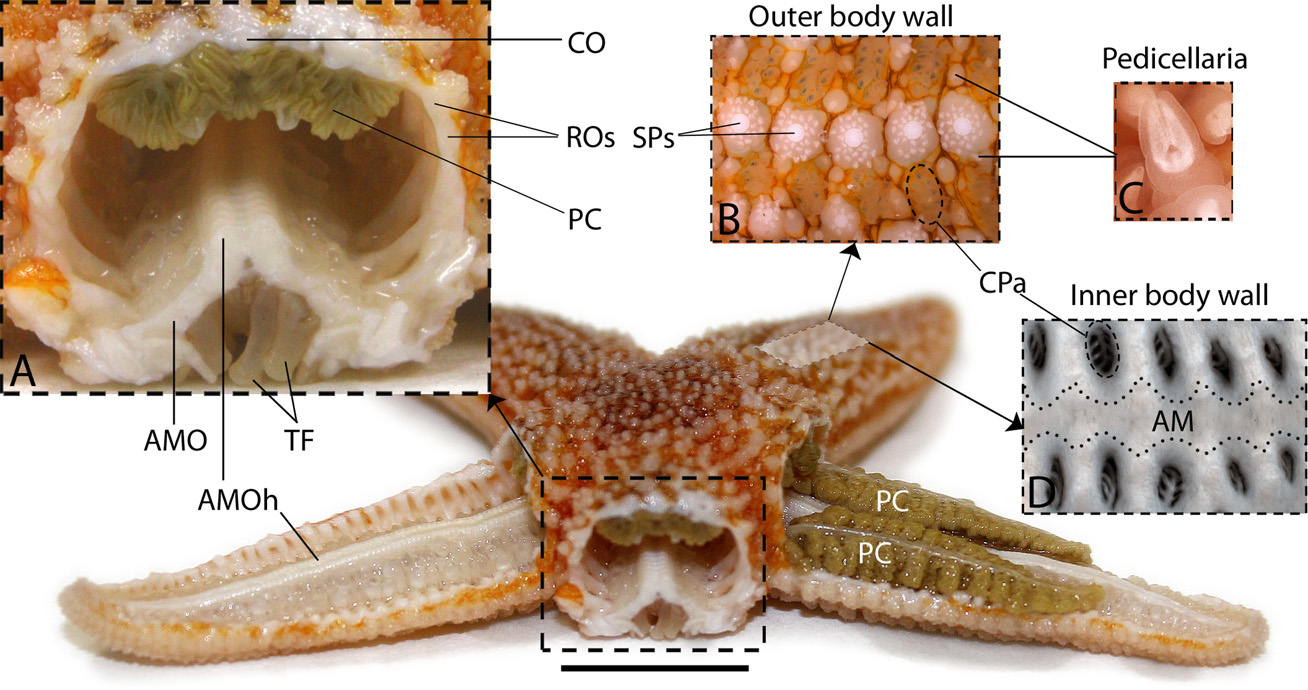 图中左上和右下的棕黄色的部分(PC)是海盘车的消化腺,是最主要的可食用部分,其余部位几乎没有食用价值。