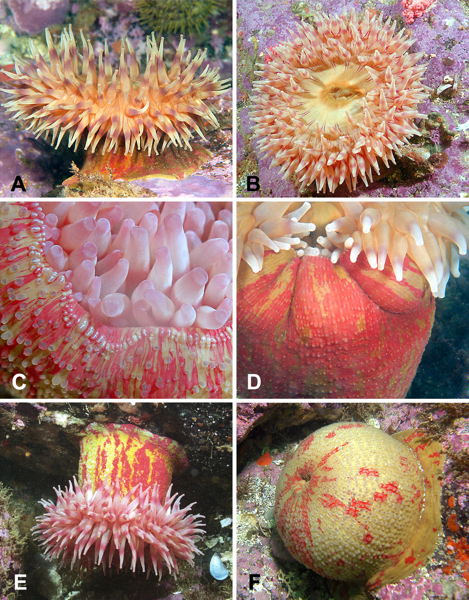 图片里蓝橙色的海星应该是Patiria pectinifera 中文语境里通常被叫做 海燕海星,英文俗称蓝蝠海星。螃蟹为平家蟹(Heikeopsis japonica),也称鬼面蟹。图片中数量最多的就是多棘海盘车了,也是当时数量爆发威胁养殖的种类。