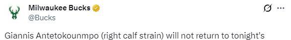 检查后,雄鹿官方宣布,字母哥遭遇右小腿拉伤,本场比赛不会回归。伤退前,字母哥仅仅出战3分钟,拿到2分1篮板。