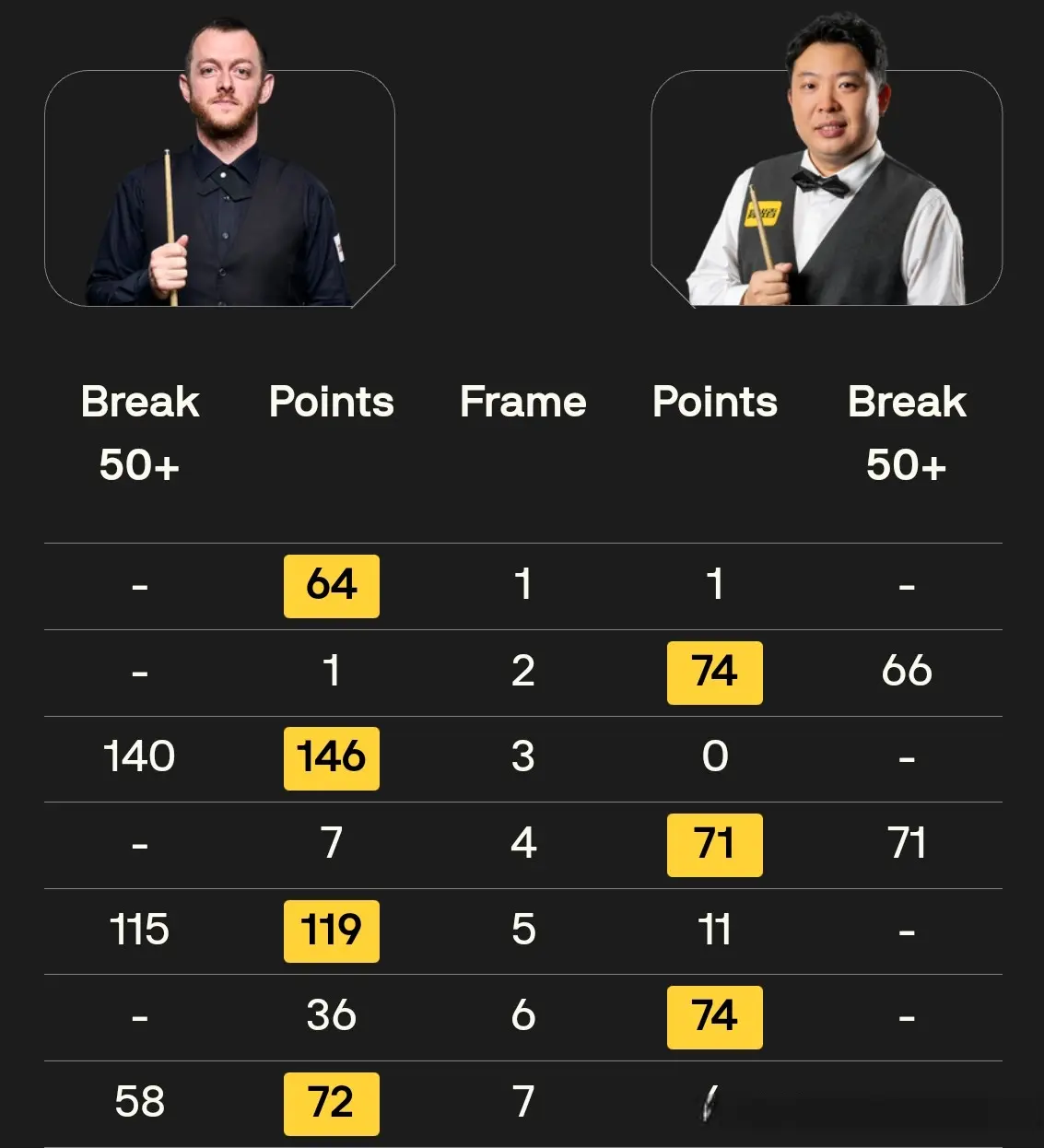 第三局,周跃龙单杆打出67分以74:42扳回一局1-2落后宾汉姆。第四局,周跃龙单杆打出100分的绝佳表现再胜一局并2-2战平宾汉姆。