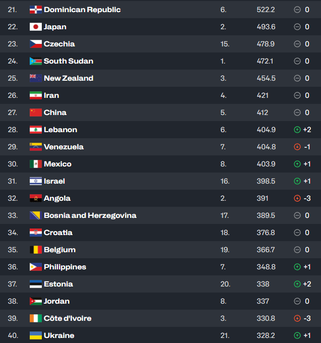 虎扑12月04日讯 世界杯男篮预选赛第一个窗口期结束,FIBA官方发布最新世界男篮实力榜排名。