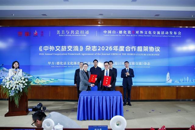 发布会上,德化县文化体育和旅游局与《中外文旅交流》杂志签署了2026年度合作框架协议,本次合作将聚焦德化白瓷国际传播英文专刊,系统打造"海丝文化高地"和"国际瓷都"新名片,有效拓宽宣传推广渠道,助推德化陶瓷文化与文旅资源走出国门,走向世界。