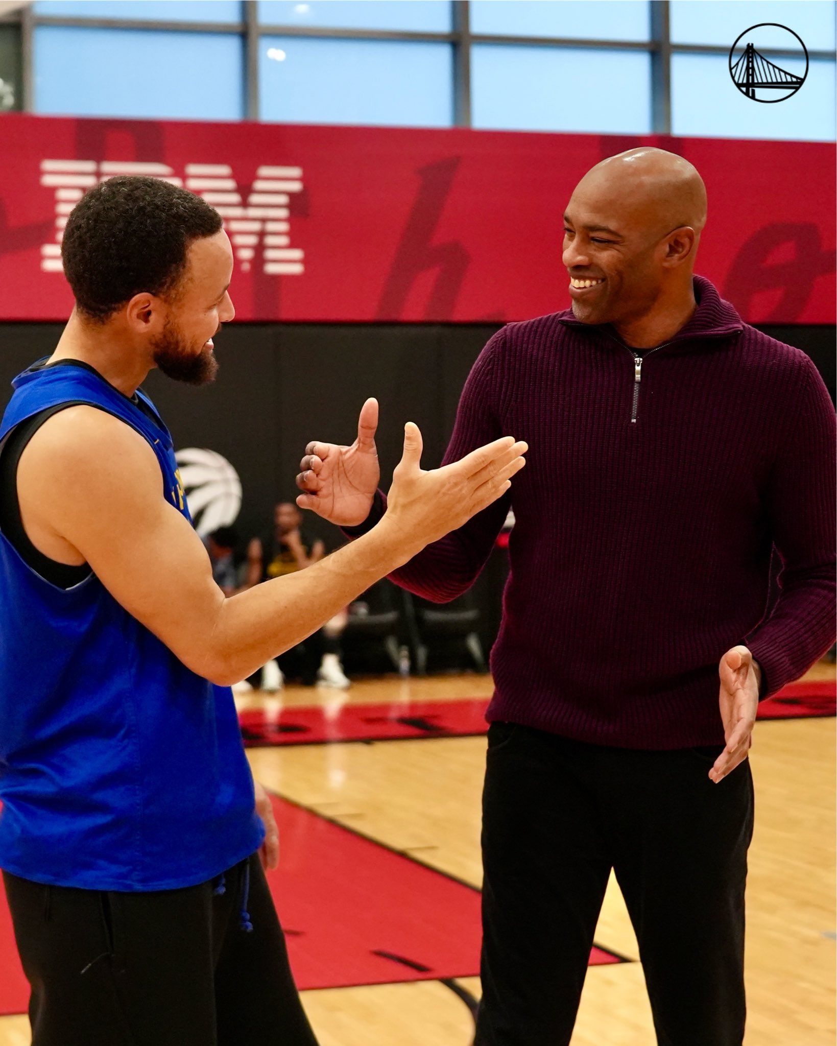 赛前,勇士社媒晒出斯蒂芬-库里与前NBA球员文斯-卡特会面的瞬间。