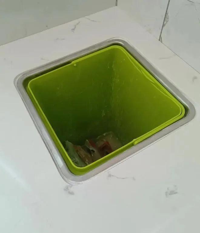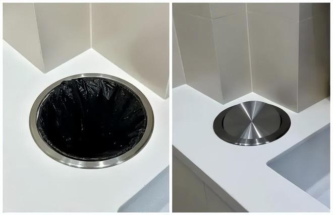 因此,也就出现了在台面上开个孔,然后将垃圾桶嵌进去,再用个盖子盖上的隐藏式设计。