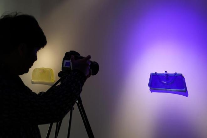 观众在欣赏由玻璃制作而成的艺术品包包。