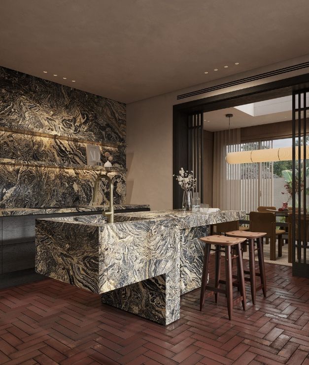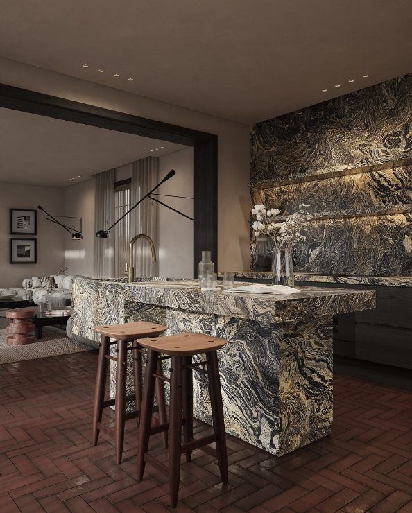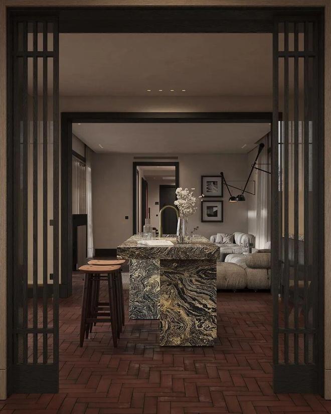 厨房真的美到犯规!石材中岛台像一件艺术品,丰富的纹理在柔和色调里撞出惊喜,却一点不突兀。吧台座位太加分了,让厨房不再是封闭的操作间,做饭时也能和客厅的人互动,日常感拉满~