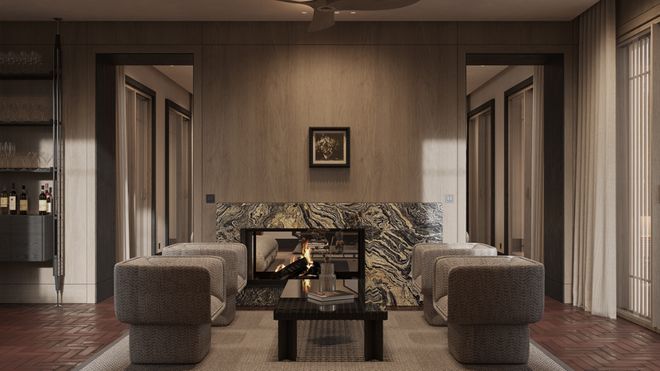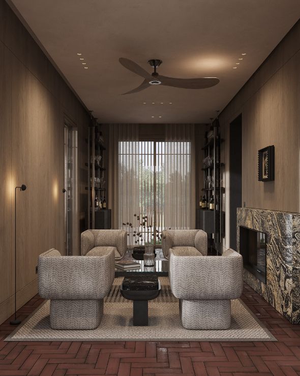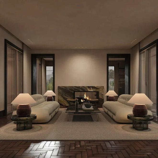 比主客厅更私密的小空间,简直是社畜福音!以壁炉为中心的对称布局,自带安稳的氛围。两张宽大的休闲椅相对摆放,纹理感的包布温柔又舒服,配上简约茶几,不管是聊天、看书,还是就静静坐着发呆,都超惬意~ 这才是“内庭之宅”的核心啊,为慢生活而生。