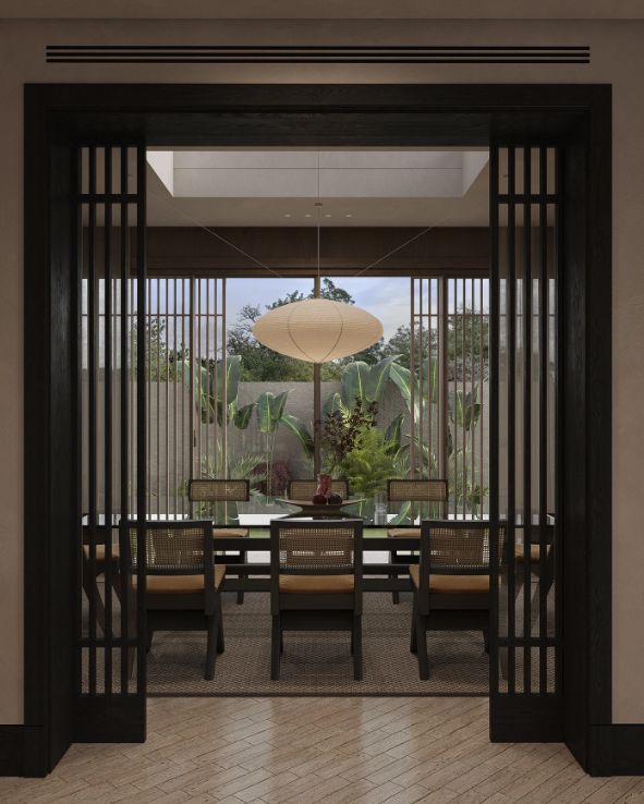 厨房外的用餐区太适合放空了!宽敞的开口框住窗外的绿意,百叶屏风柔化了阳光,吃饭都变成了有仪式感的事~ 在这里用餐,连心情都变得沉静又愉悦。