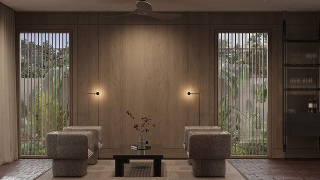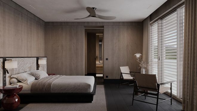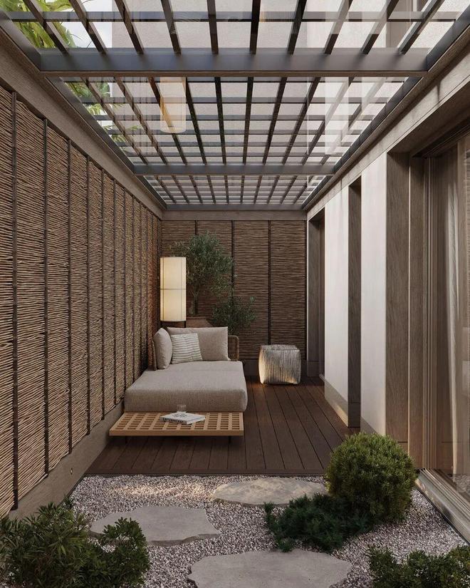 另一间卧室更绝!直接连到私密户外区域~ 编织墙面、木质甲板、柔软的户外座椅,把休憩感延伸到室外。室内外无缝衔接,更懂“内庭之宅”的温柔了。