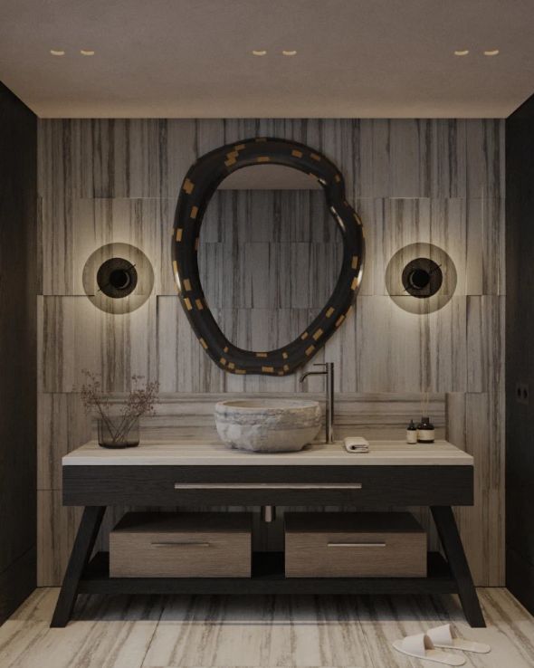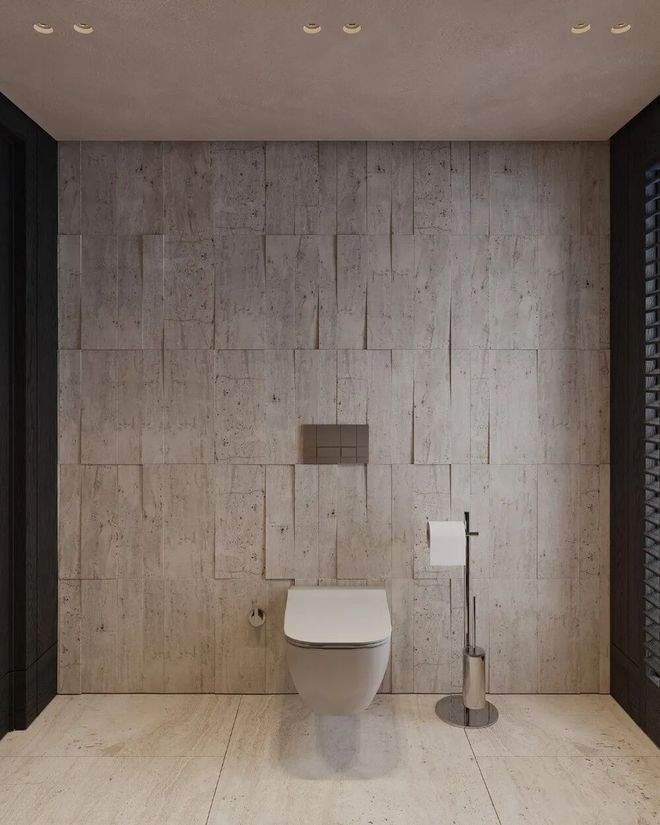 卫浴间把“宁静”和“雕塑感”融合得恰到好处!带肌理的石材背景,自带水疗氛围~ 雕塑般的石材台盆是焦点,搭配简洁的盥洗台和极简配件,没有多余的杂乱感。柔和的壁灯+装饰镜,温暖又高级,洗漱都变成了享受~
