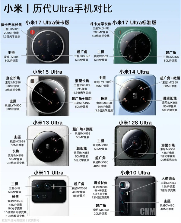 【CNMO科技消息】1月15日,有博主发布了一张小米历代“UItra”机型影像配置对比图。各机型的影像配置具体如下: