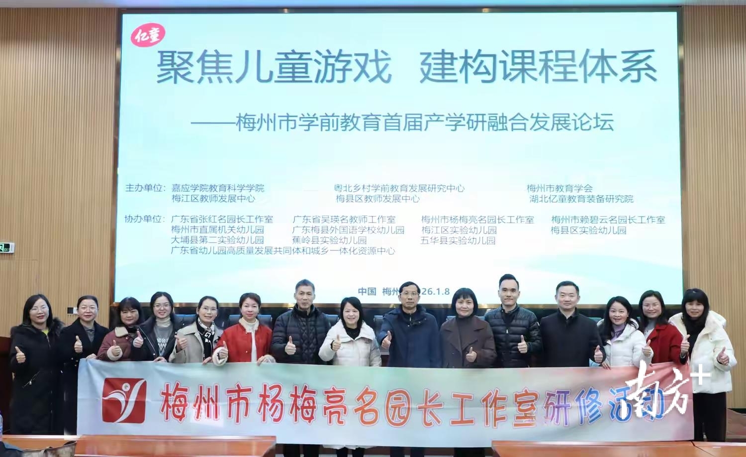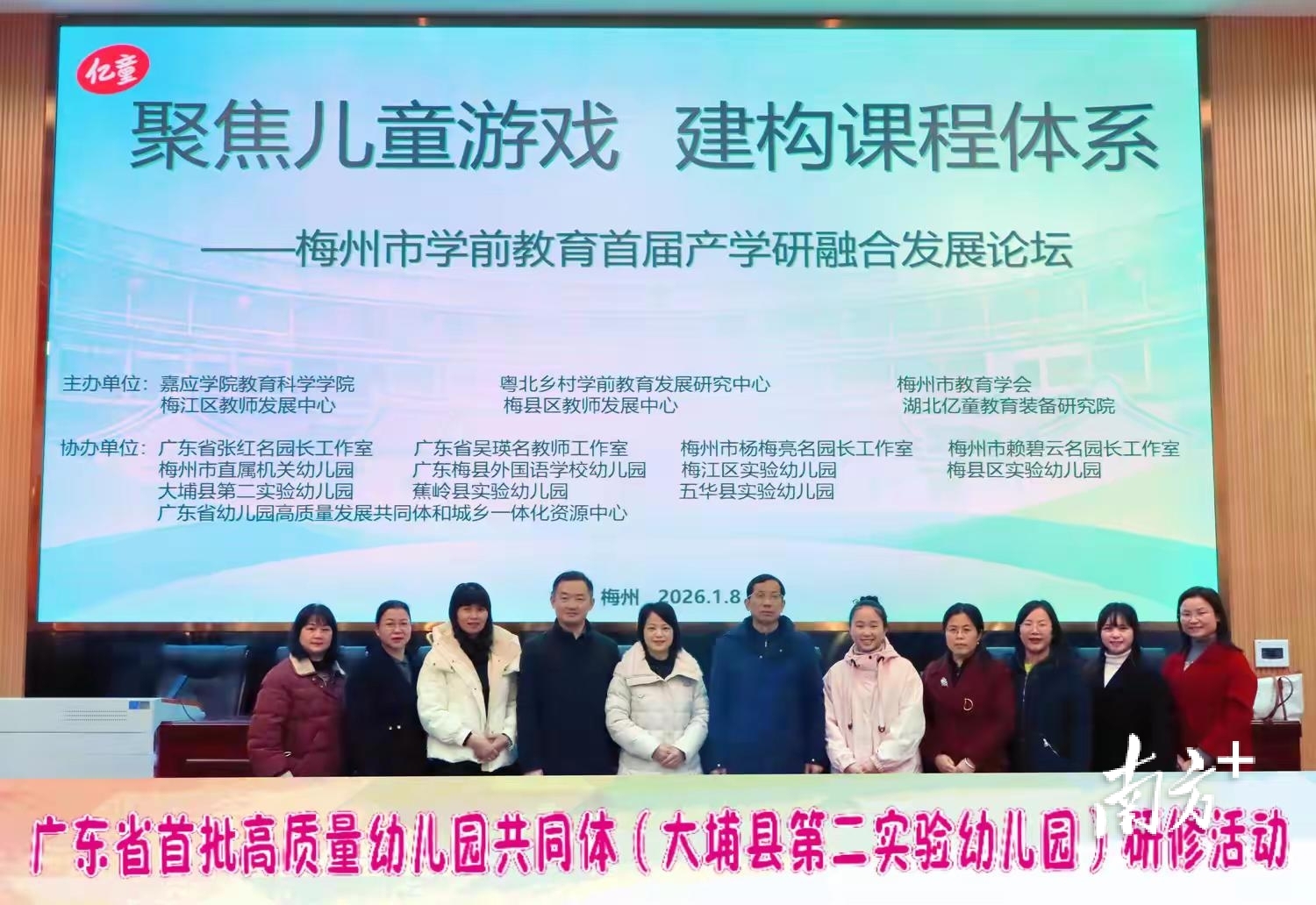 为深化幼儿园课程改革,构建高质量课程体系,2026年1月8日,广东省首批高质量幼儿园共同体(大埔县第二实验幼儿园)、梅州市杨梅亮名园长工作室各成员,一同奔赴嘉应学院参加“聚焦儿童游戏 建构课程体系”梅州市学前教育首届产学研融合发展论坛,开启了一场关于学前教育课程创新发展的深度探索之旅。