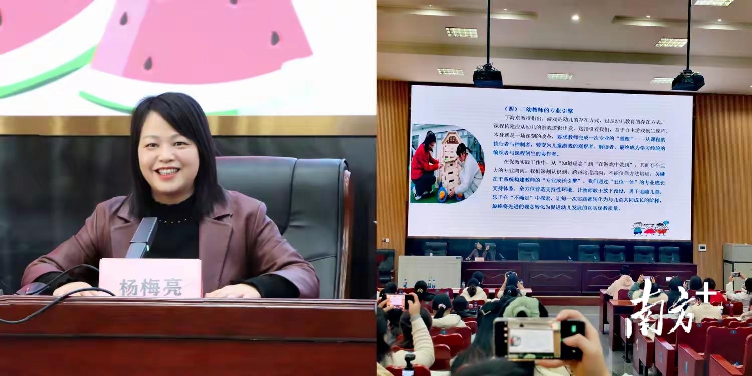 大埔县第二实验幼儿园教育集团总园长、梅州市杨梅亮名园长工作室主持人杨梅亮带来《基于自主游戏创生课程的二幼实践路径》专题讲座,其结合二幼教育集团的办园实践,讲述从自主游戏中挖掘课程资源、创生园本课程的探索过程与实施路径。讲座内容详实、聚焦实践,为一线教师提供了可操作、可借鉴的宝贵经验。