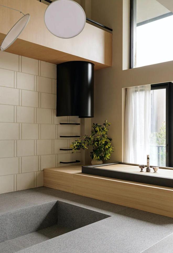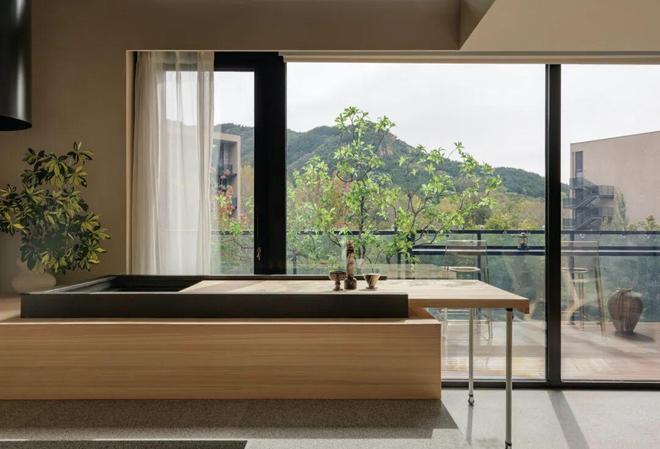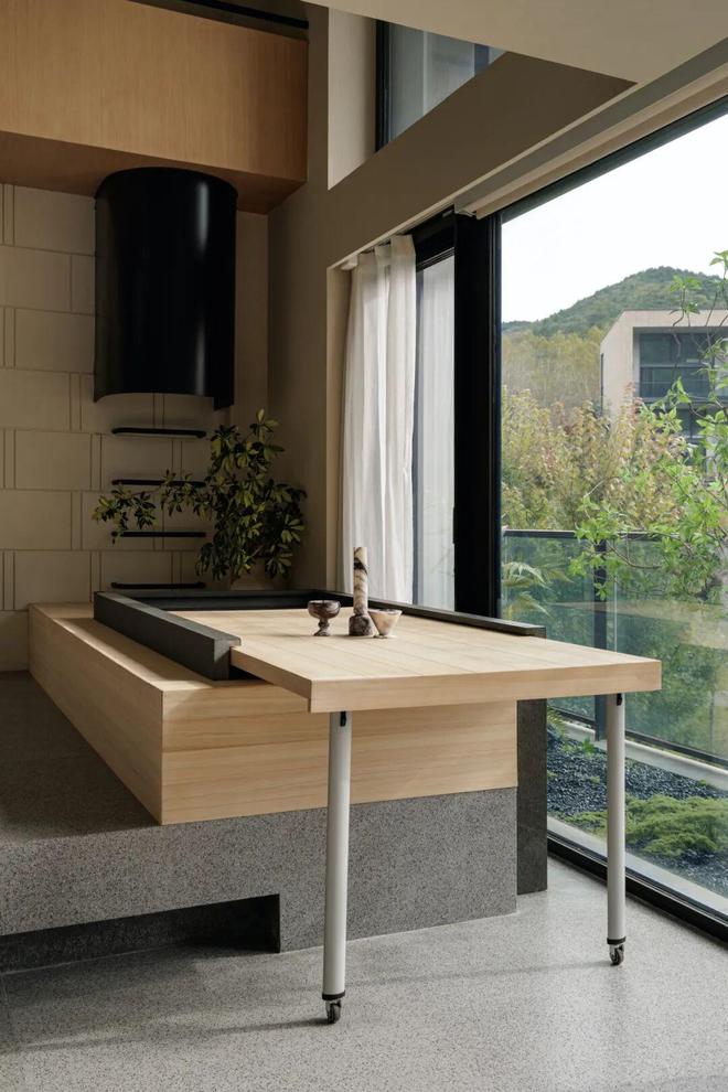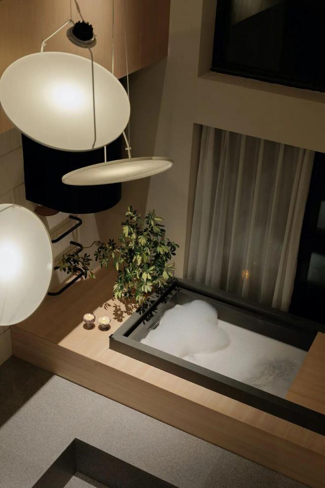 泡汤—地台—窗景,这三者的完美搭配,设计师也是经过了各种努力才搭建而成。还有更为巧妙的是,设计师在泡汤池上设计了一面严丝合缝的桂木盖板,又让其多了另一重身份。