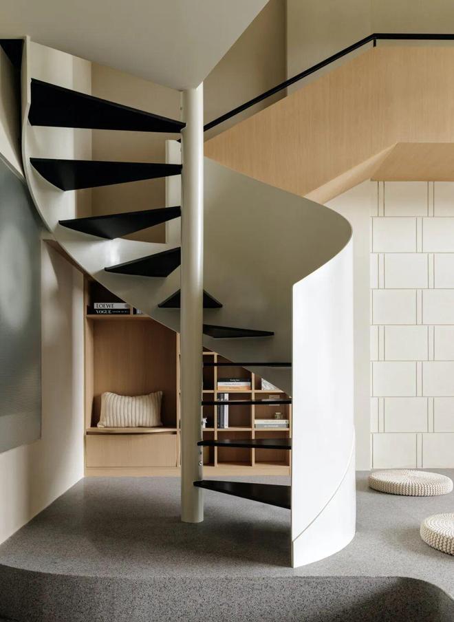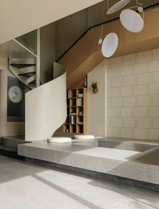 利用地台抬高的空间,是孩子与大人都很喜爱的场所,可围坐、可冥想、可穿梭,搭建的旋转楼梯与二层形成了串联,在其中还巧妙嵌入一道小滑梯,多了更多趣味性。“儿童乐园之感”被悄然融入进来,孩子们自然更喜欢。