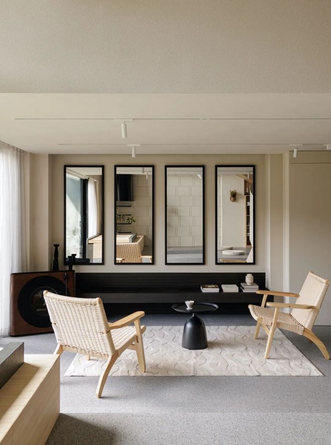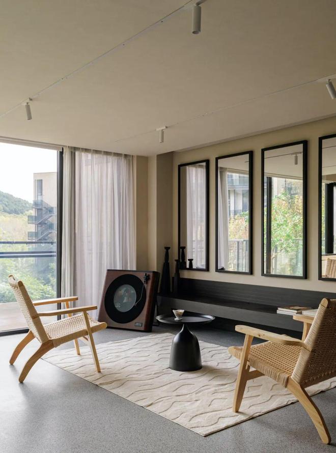 而墙上四面连续的镜面,则是为了开阔会客厅的进深,增加空间感,同时也提升了趣味互动性。镜面中反射出来的柔和光线、室外景色,也给其增添了不少的独特景观,让空间在虚实之间散发魅力。