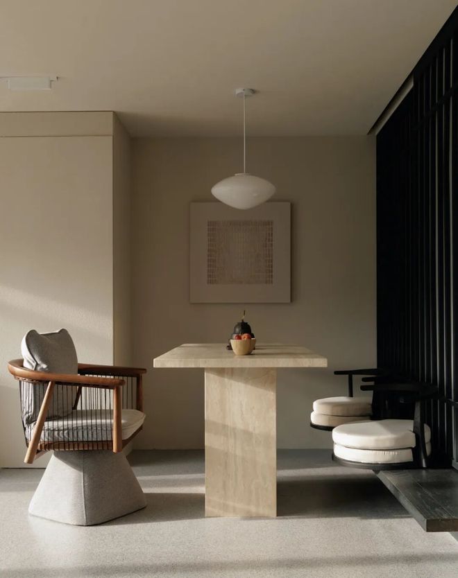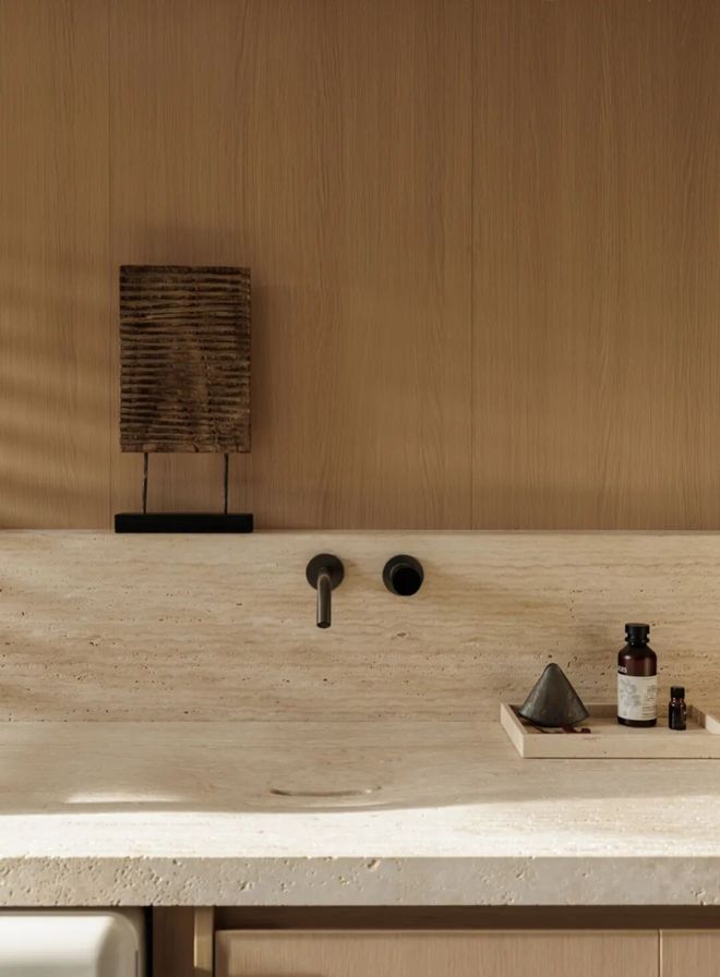舍弃原本的精装厨房,将其打造一处充满禅意的空间,更符合度假属性。天然石材散发温润静谧之感,一方小天地却拥有大格局的气派。