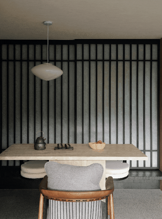 榻榻米包间式卧区,让禅室更有包裹感。在推拉门开合间转化着姿态,使得这里可以是独身一人修习冥想的静室,也可以是三五好友对坐品茗的佳地。茶香与线香萦绕于此,清退浊气、洗净心灵,自然而然找到那份内心的归属感。