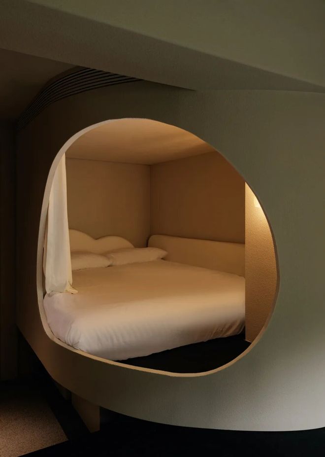 二楼的主卧是个充满浪漫气息的场域,墙上竟然向外“长”出了一个会呼吸的泡泡球,梦幻又有趣,互动感十足,令人忍不住想去体验一番。球体内部是安全的,可容纳成人静坐或孩子嬉戏,如此一来,主卧不再是单纯的休憩空间,更多了几分不俗的趣味。