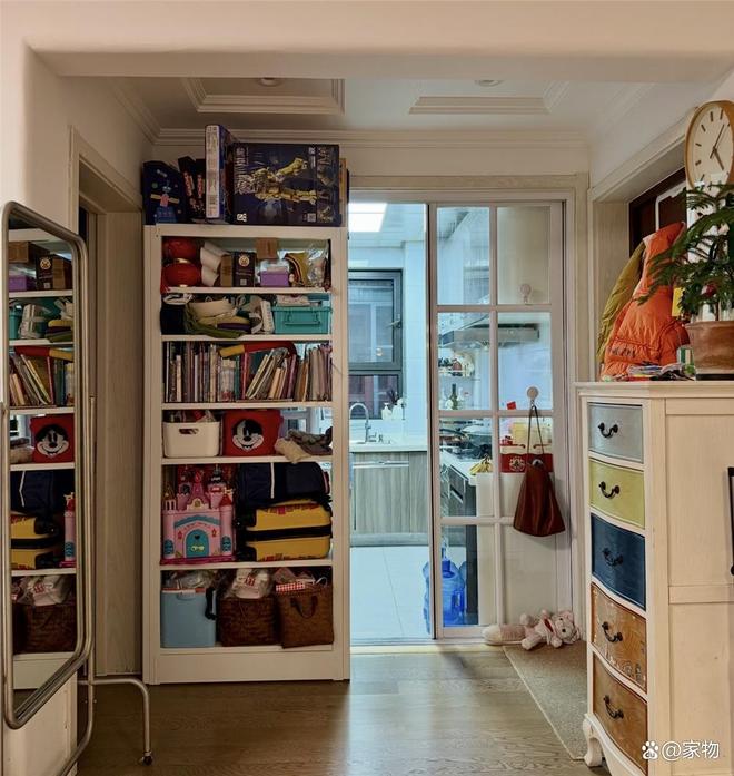 毕竟是二胎家庭,家里的东西自然不会少,为了能将孩子的各种杂物放下,夫妻俩在这里放了两组柜子,一组开放柜,一组抽屉柜,基本都算是高柜;里面也塞得满满当当,但总算让地面其他空间显得利落了不少,也算是乱中有序了。