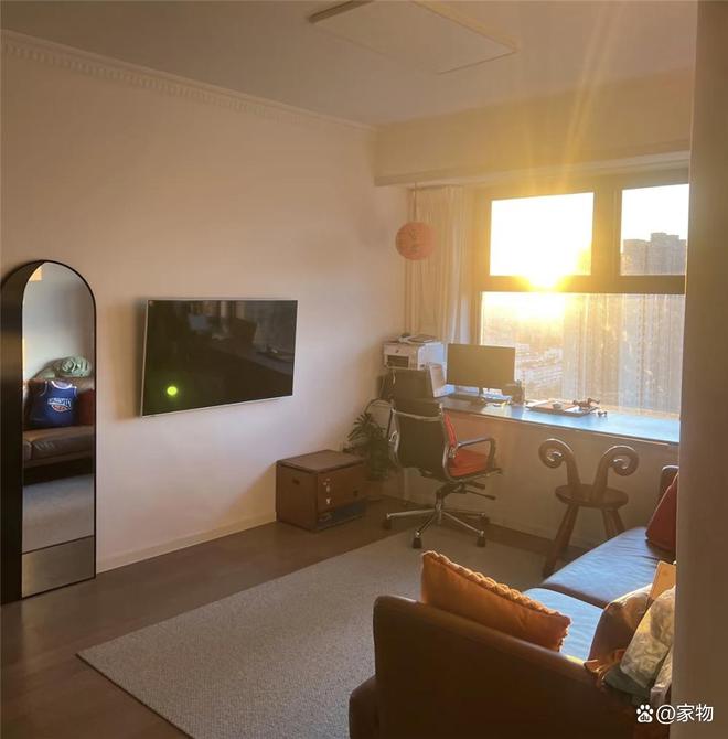 转过身来进入客厅,这里的布置就更是简单了——一张双人位沙发靠墙摆放,对面的电视墙简化到只壁挂了一台小电视,中间甚至连茶几都没放,而是用地毯划分出客厅区域,留出活动空间、显得宽敞的同时,也在朝向窗户的地方做了一张双人位学习桌。